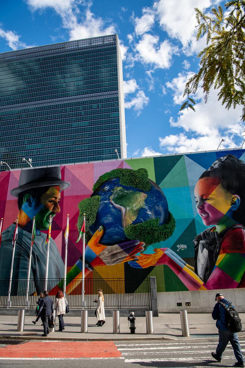 Caption Description A view of the Eduardo Kobra mural at UN Headquarters.