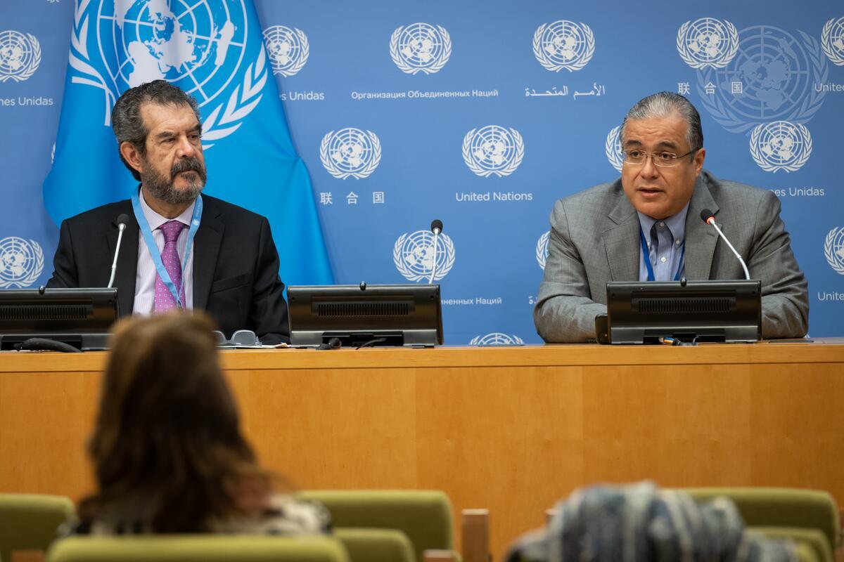 Edgar Corzo Sosa (right), Chair of the Committee on the Protection of the Rights of All Migrant Workers and Members of Their Families, briefs reporters on the situation for Migrants. At left is Felipe González Morales, Special Rapporteur on the human rights of migrants.