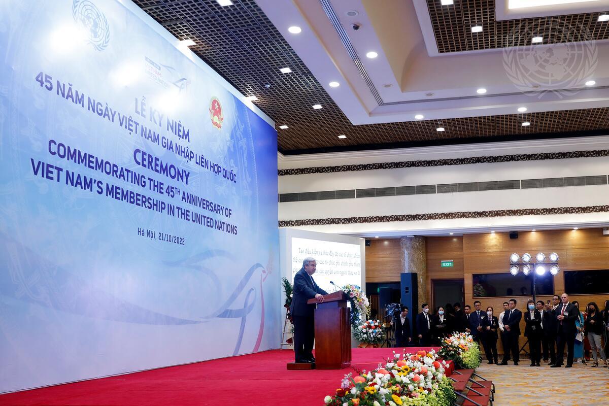 Secretary-General António Guterres (at podium) addresses the ceremony to commemorate the 45th anniversary of Viet Nam’s membership in the United Nations, in Hanoi, Viet Nam.
