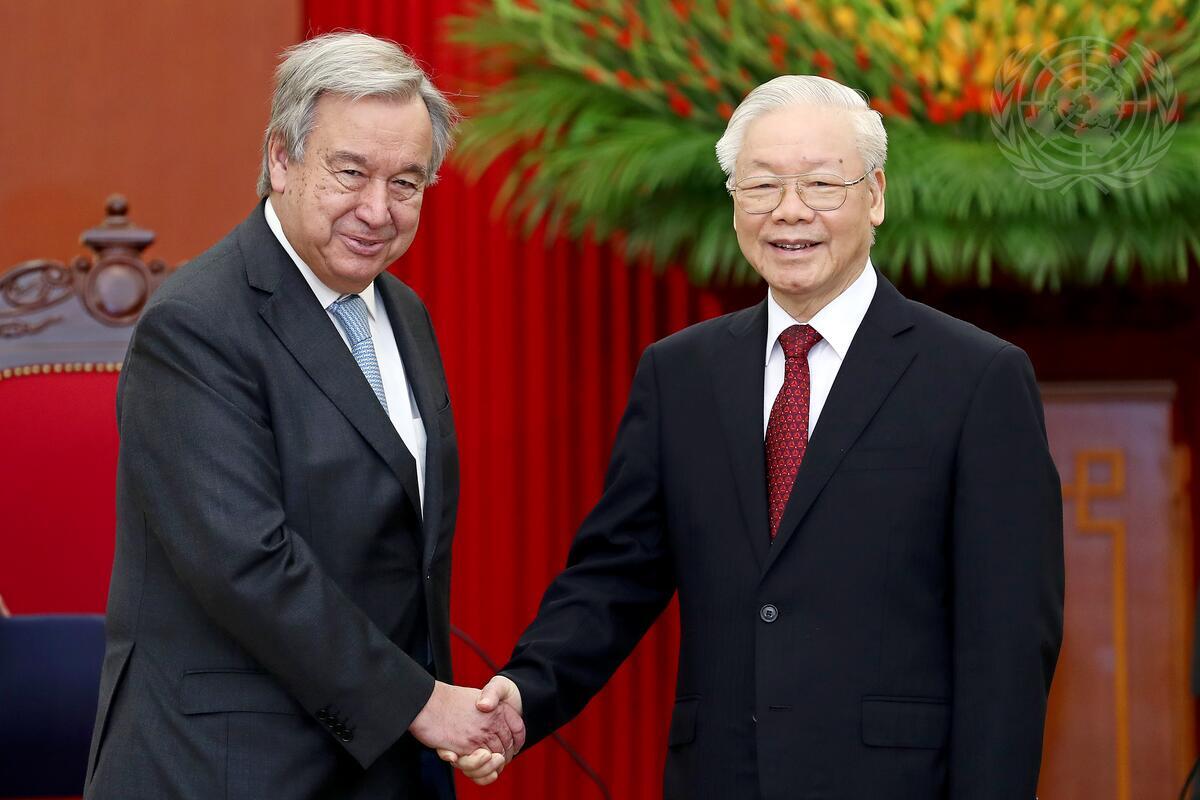 Secretary-General António Guterres (left) meets with Nguyen Phu Trong, General Secretary of the Communist Party, in Hanoi, Viet Nam.