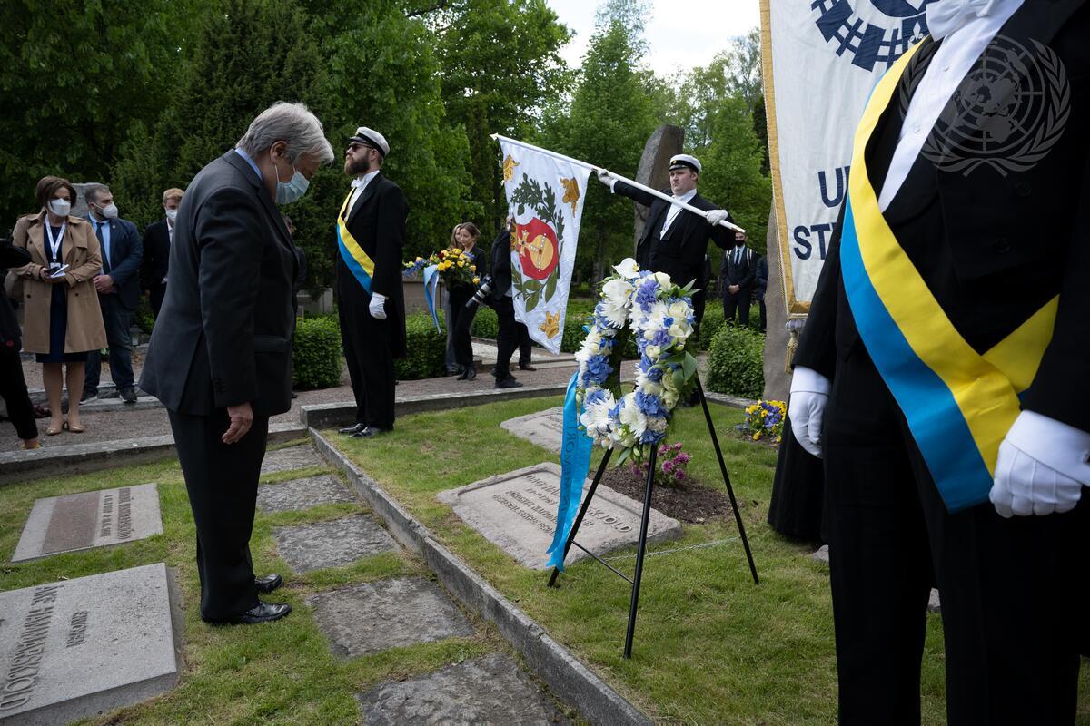 Secretary-General António Guterres (centre left) lays a wreath at the grave of former Secretary-General Dag Hammarskjöld in Uppsala, Sweden.