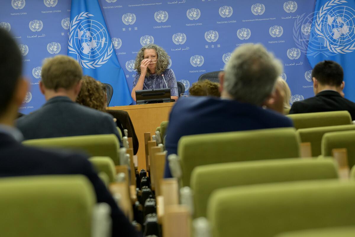 Denise Brown (at dais), United Nations Resident Coordinator in Ukraine, briefs reporters at UN Headquarters.