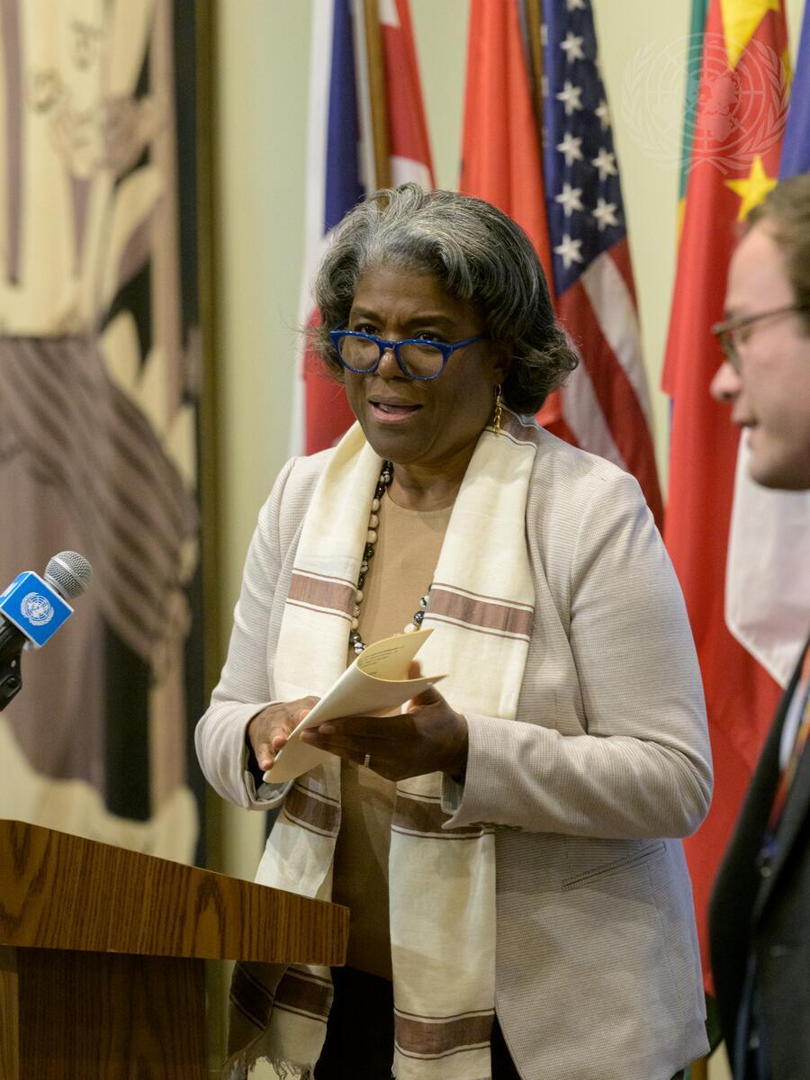 Linda Thomas-Greenfield, Permanent Representative of the United States to the United Nations, after a closed Security Council meeting on Peace and security in Africa (Ethiopia).