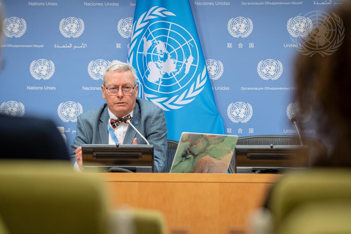 Ian Fry, Special Rapporteur on the promotion and protection of human rights in the context of climate change, briefs reporters at UN Headquarters.