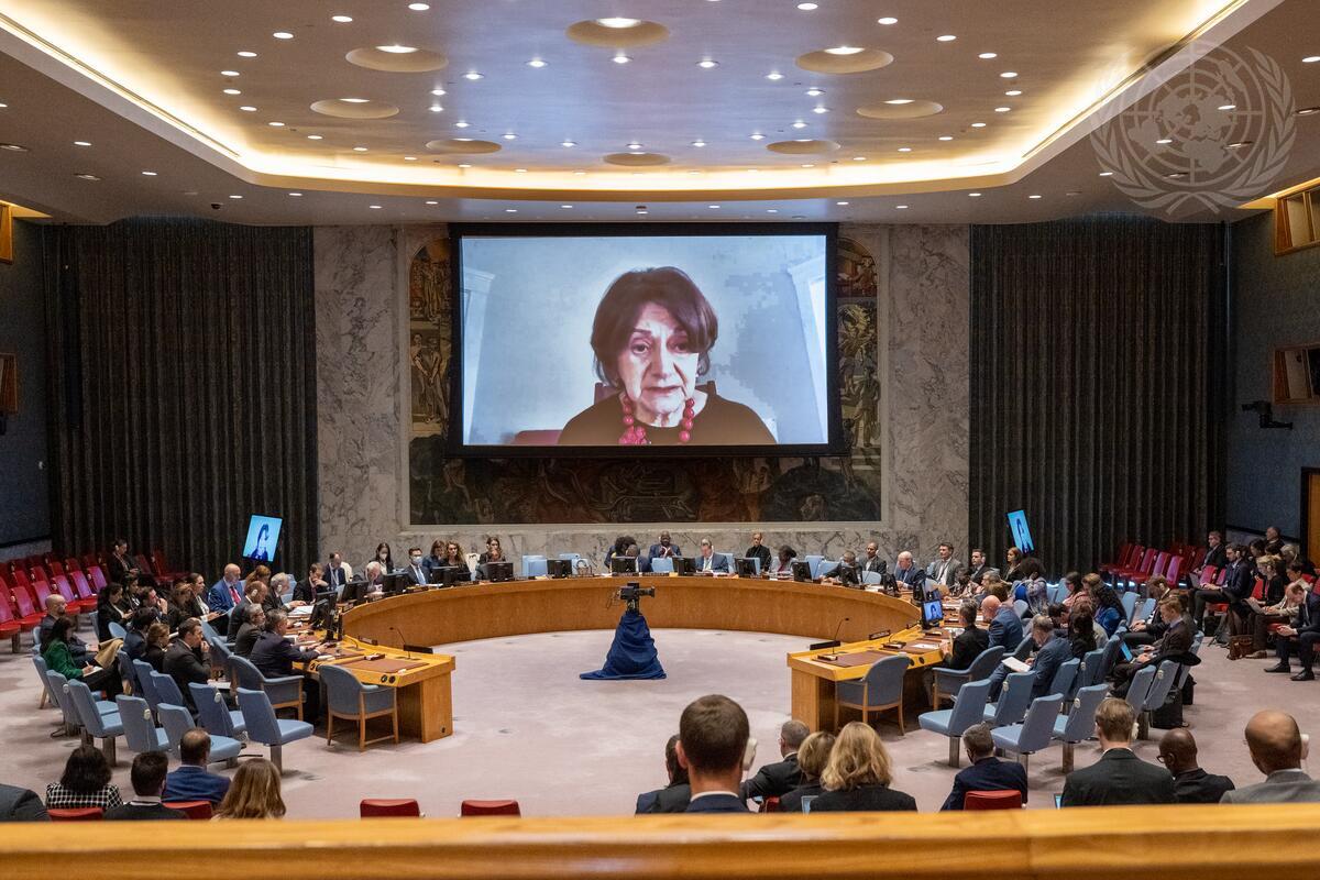 On the screen is Rosemary DiCarlo, Under-Secretary-General for Political and Peacebuilding Affairs.