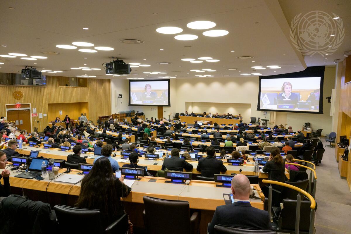 A wide view of the special event on “Reducing inequalities – implementing Human Rights” is held on the side of the UN 2023 Water Conference. On the screens are Ilze Brands Kehris, Assistant Secretary-General for Human Rights in the Office of the High Commissioner for Human Rights (OHCHR).