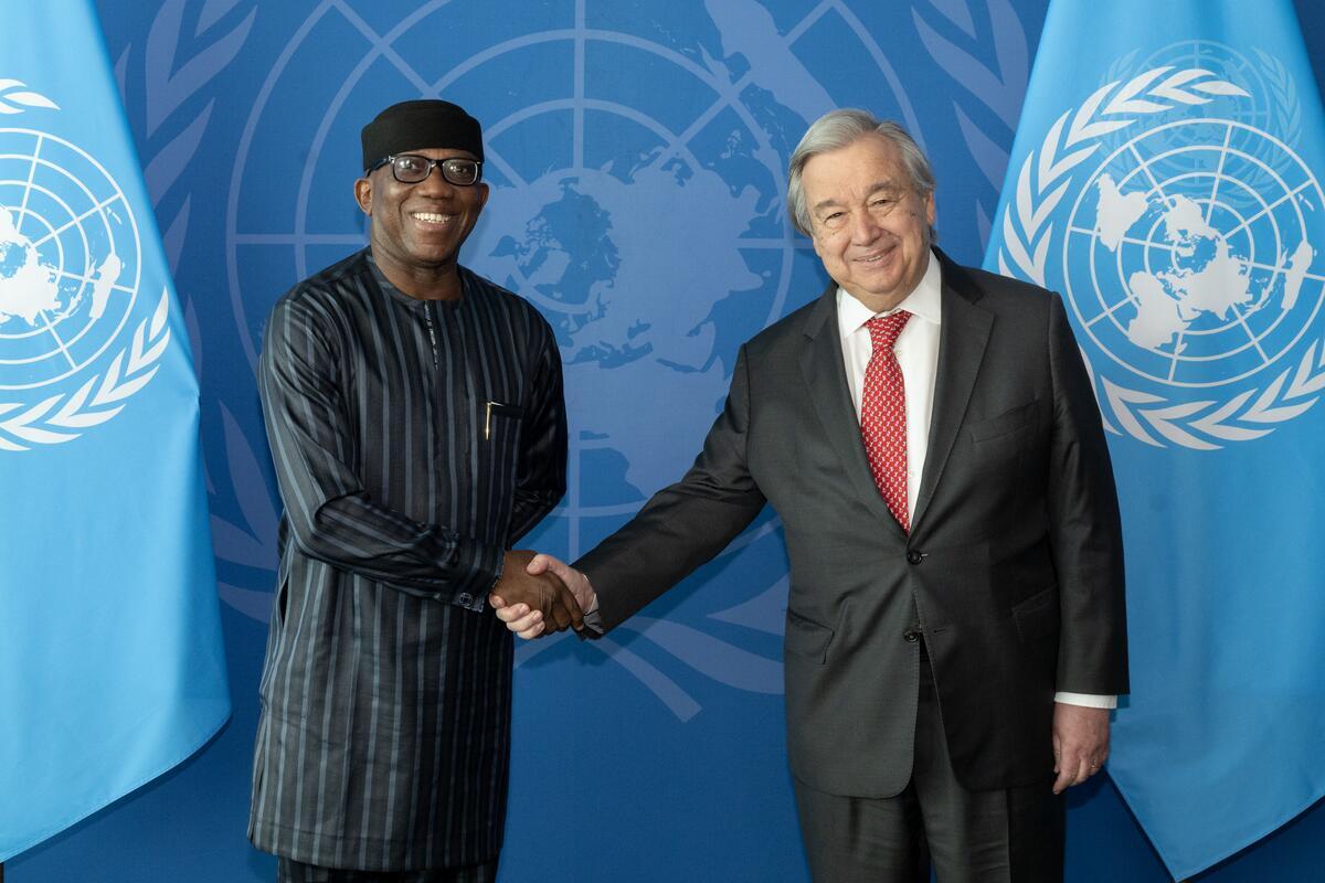 Secretary-General António Guterres (right) meets with Bankole Adeoye, Commissioner for Political Affairs, Peace and Security of the African Union Commission.
