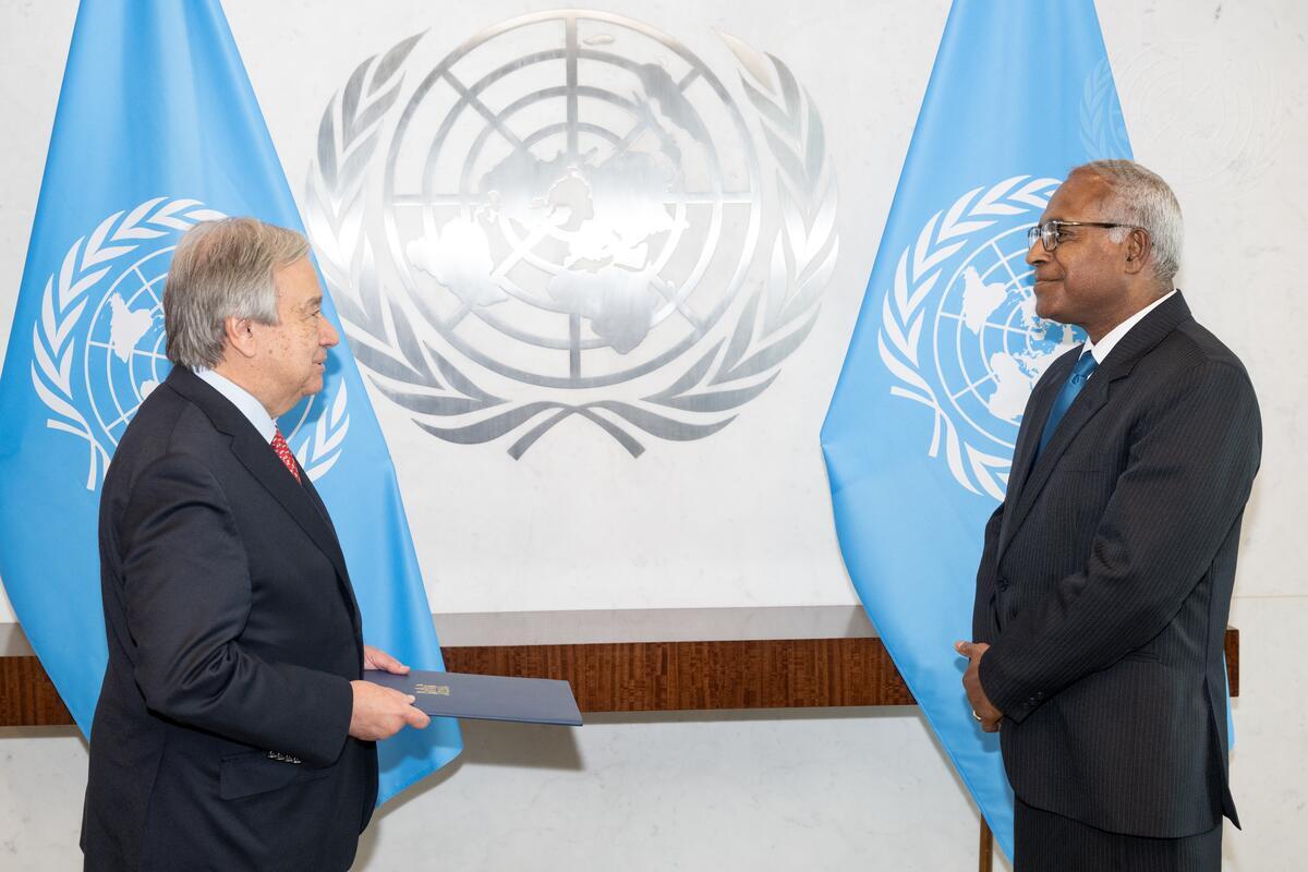 Filipo Tarakinikini (right), Permanent Representative of the Republic of Fiji, presents his credentials to Secretary-General António Guterres.