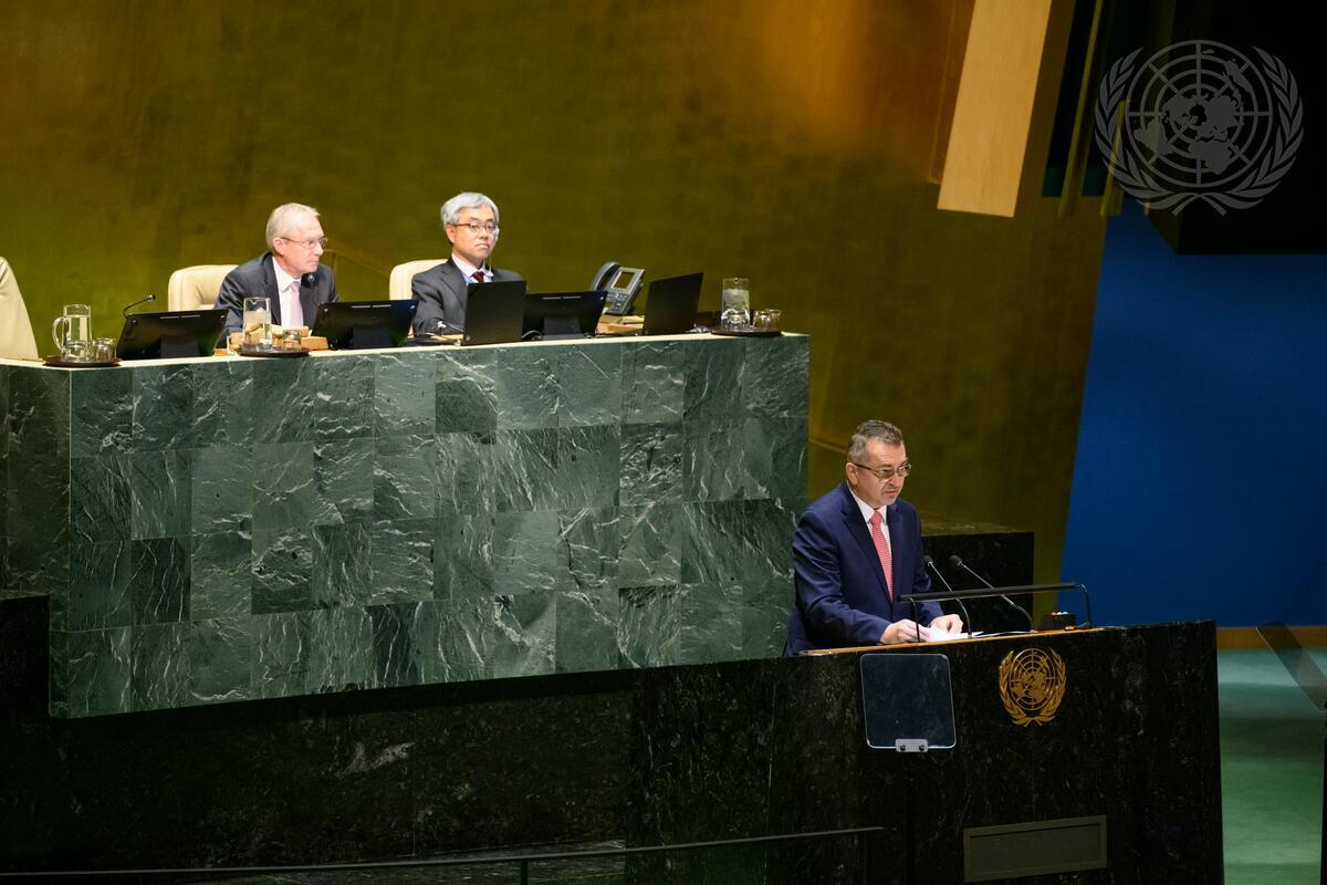 Seated at dais are Csaba Kőrösi (left), President of the seventy-seventh session of the United Nations General Assembly, and Kenji Nakano, Chief of the General Assembly Affairs Branch, Department for General Assembly and Conference Management (DGACM).