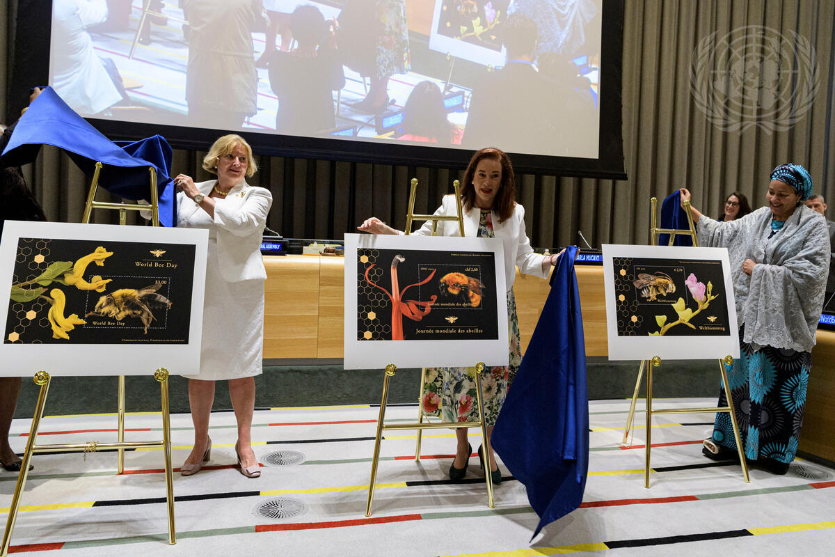 Darja Bavdaž Kuret (left), Permanent Representative of the Republic of Slovenia to the United Nations, María Fernanda Espinosa Garcés (centre), President of the seventy-third session of the General Assembly, and Deputy Secretary-General Amina Mohammed unveil the designs for postage stamps created to mark the annual observance of World Bee Day (20 May).