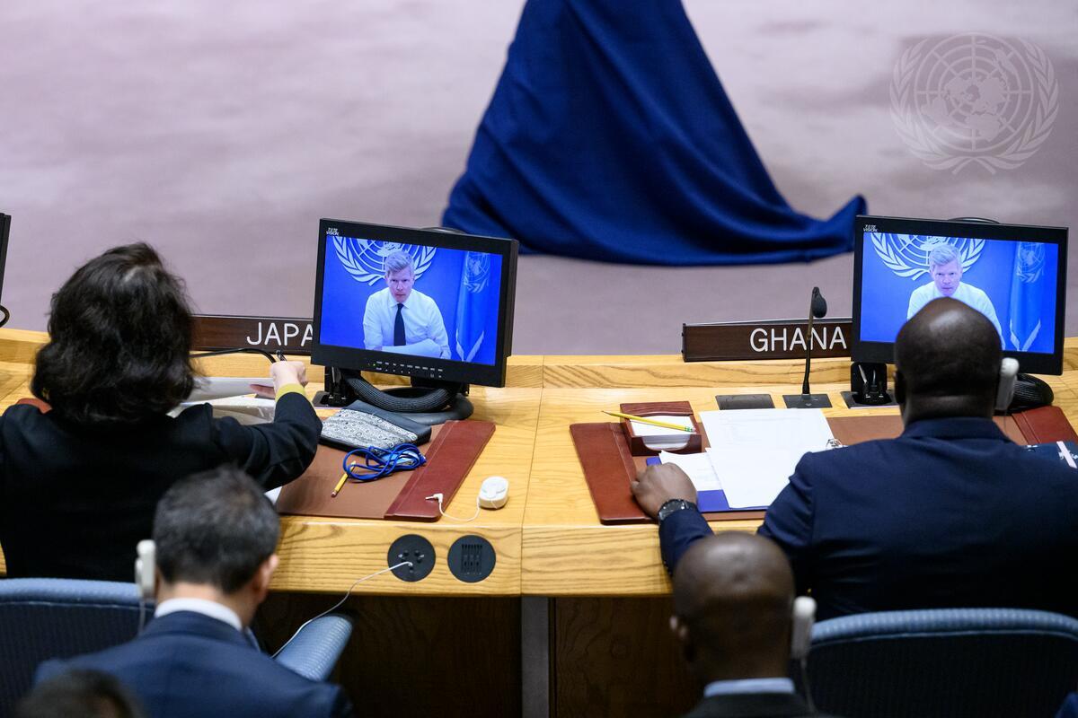 Hans Grundberg (on screens), Special Envoy of the Secretary-General for Yemen, briefs the Security Council meeting on the situation in the Middle East (Yemen).