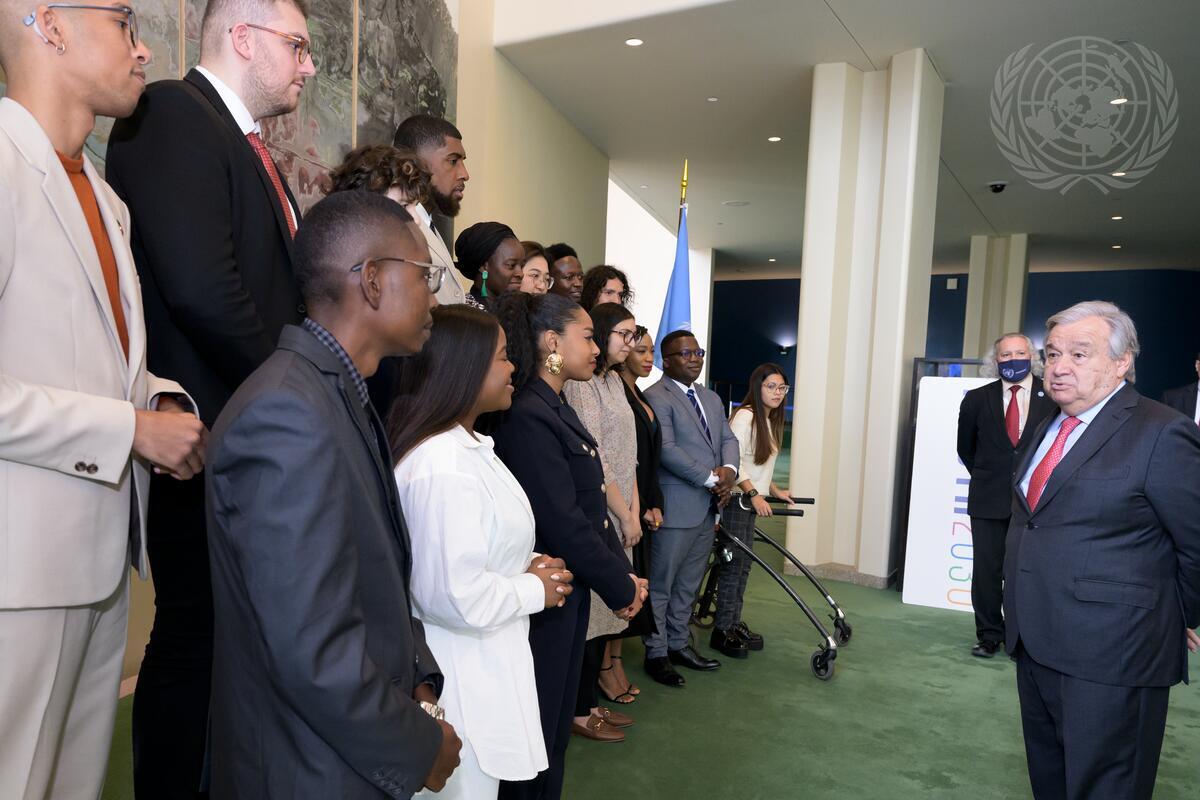 Secretary-General António Guterres (right) meets with Young Leaders for the Sustainable Development Goals.