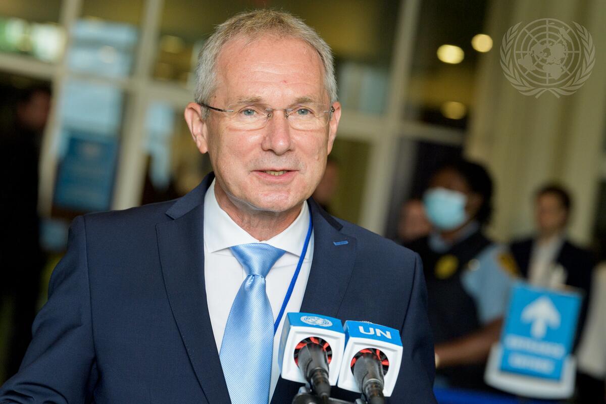 Csaba Kőrösi, President-elect of the seventy-seventh session of the United Nations General Assembly, briefs reporters at UN Headquarters after being elected President of 77th UN General Assembly.