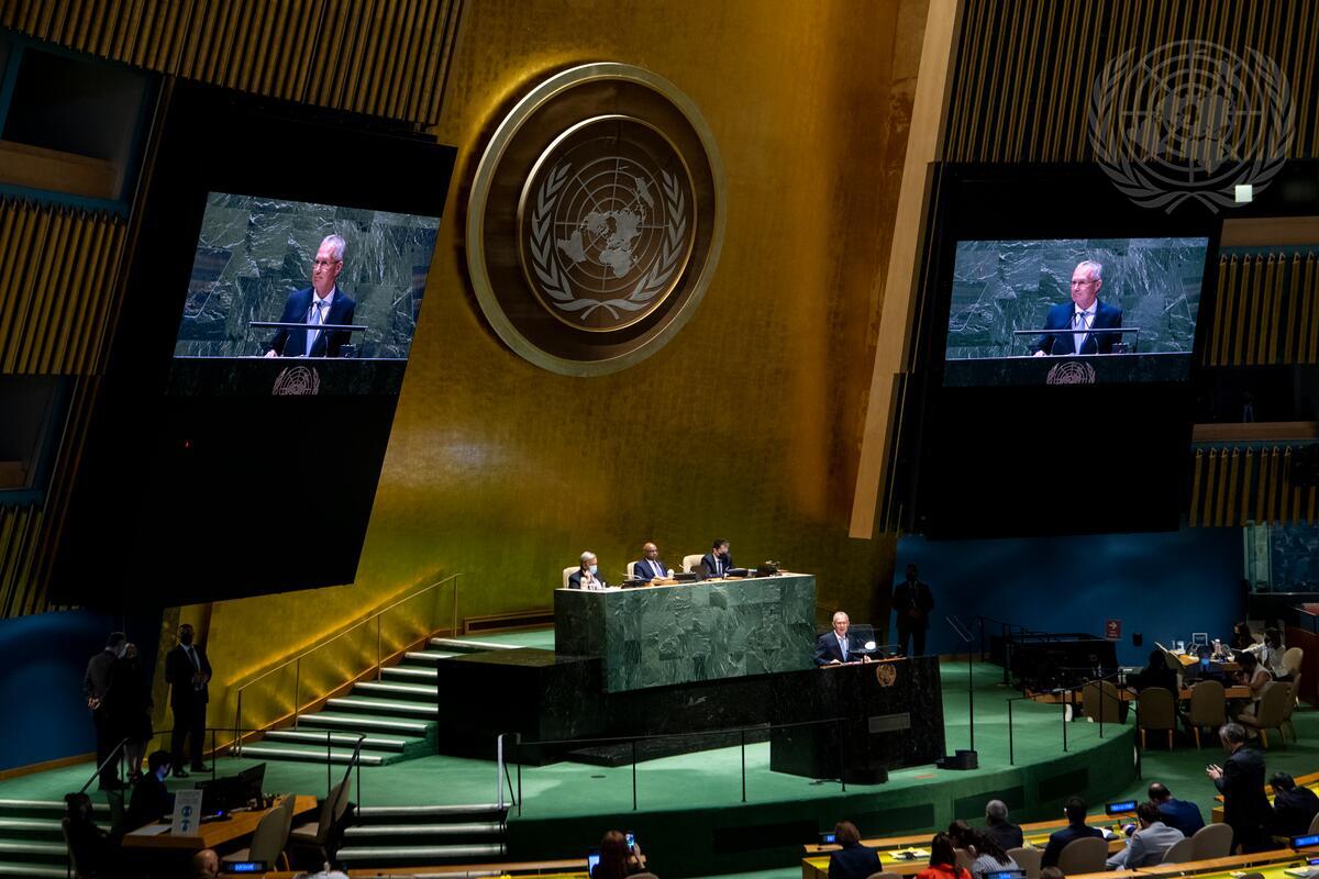 Csaba Kőrösi (at podium and on screens), President-elect of the seventy-seventh session of the United Nations General Assembly, addresses the 75th plenary meeting of the 76th session of the General Assembly. The Assembly elected Csaba Kőrösi of Hungary as President of the seventy-seventh session of the UN General Assembly during the meeting.
