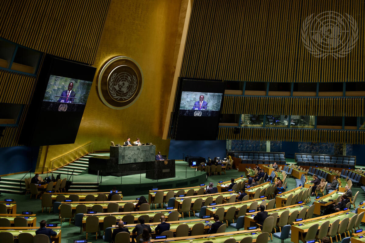Lazarus Ombai Amayo (on screens and at podium), Permanent Representative of Kenya to the United Nations, introduces the draft resolution on Sustainable development and Oceans and the law of the sea. The resolution was adopted and decides to convene the high-level 2020 United Nations Conference to Support the Implementation of Sustainable Development Goal 14: Conserve and sustainably use the oceans, seas and marine resources for sustainable development in Lisbon, from 2 to 6 June 2020.