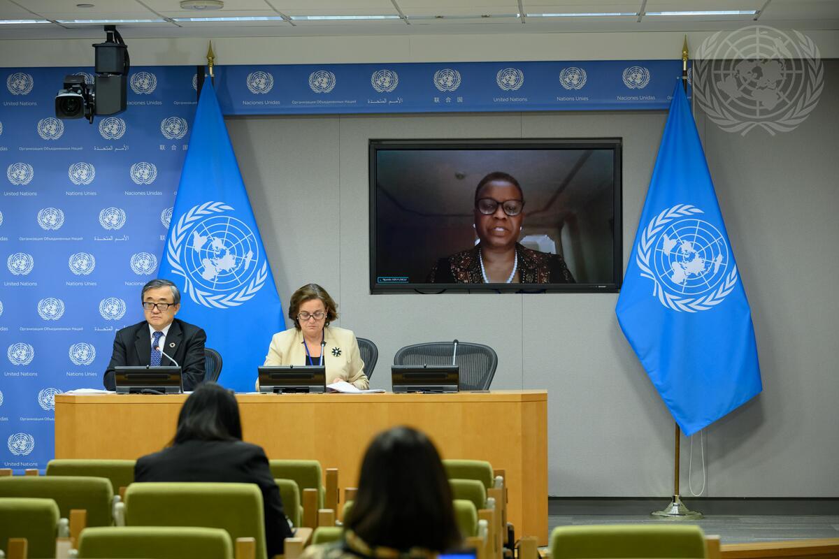 Liu Zhenmin (left at dais), Under-Secretary-General for Economic and Social Affairs; Ana Paula Zacarias (right at dais), Permanent Representative of Portugal to the United Nations, and Njambi Kinyungu (on screen), Deputy Permanent Representative of Kenya to the United Nations, brief reporters on the upcoming UN Ocean Conference, which will take place from 27 June to 1 July in Lisbon, Portugal.