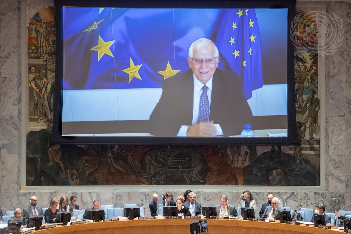 Josep Borrell (on screen), High Representative of the European Union for Foreign Affairs and Security Policy, addresses the Security Council meeting on cooperation between the United Nations and European Union in maintaining international peace and security.