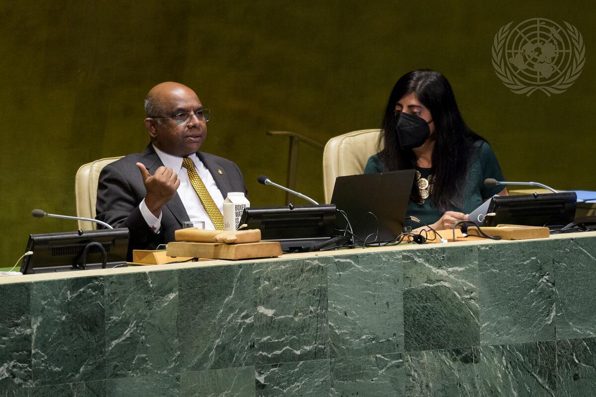 Abdulla Shahid, President of the seventy-sixth session of the United Nations General Assembly, chairs the General Assembly meeting on protracted conflicts in the GUAM area (Georgia, Ukraine, Azerbaijan, Moldova) and their implications for international peace, security, and development.