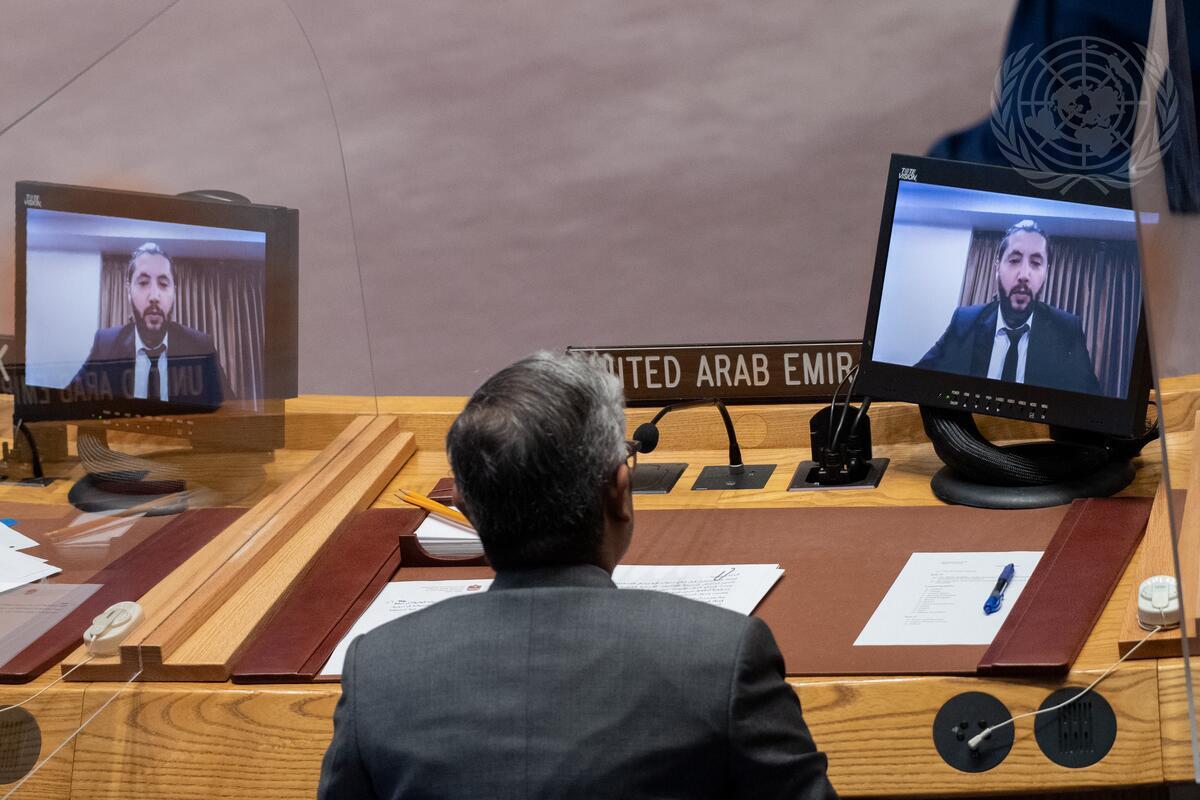 Iyad Agha (on screens), NGO Forum Coordinator of North West Syria NGO Forum in Gaziantep, Turkey, briefs the Security Council meeting on the situation in the Middle East (Syria).
