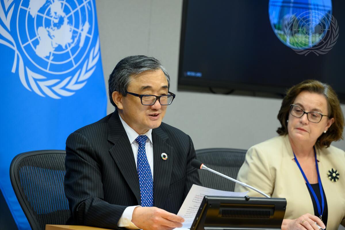 Liu Zhenmin (left), Under-Secretary-General for Economic and Social Affairs, briefs reporters on the upcoming UN Ocean Conference, which will take place from 27 June to 1 July in Lisbon, Portugal. At right is Ana Paula Zacarias, Permanent Representative of Portugal to the United Nations.