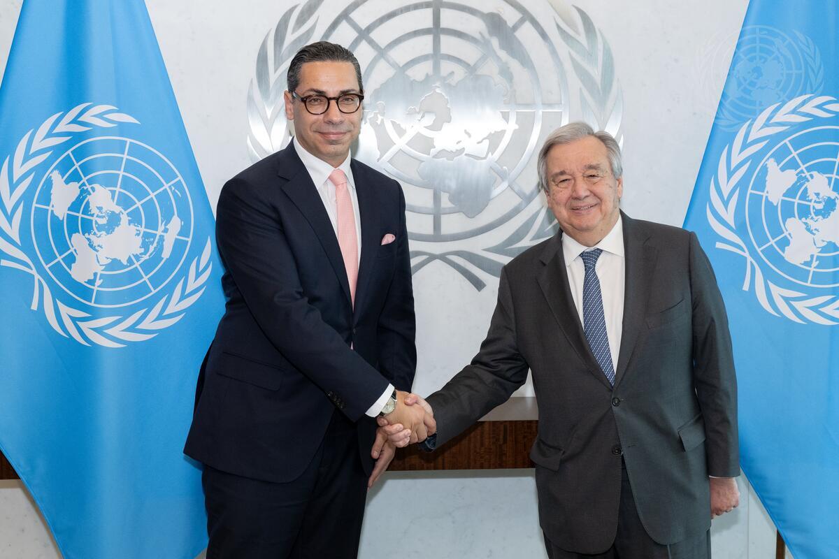 Secretary-General António Guterres (right) meets with Constantinos Kombos, Minister for Foreign Affairs of the Republic of Cyprus.