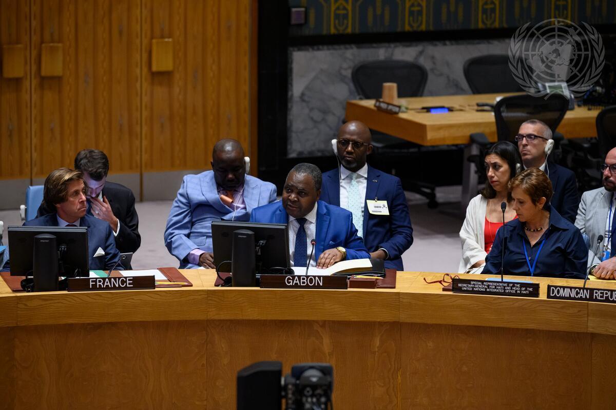 Michel Xavier Biang (centre at table), Permanent Representative of Gabon to the United Nations, briefs, in his capacity as Chair of the Security Council Committee pursuant to resolution 2653, the Security Council meeting on the question concerning Haiti.