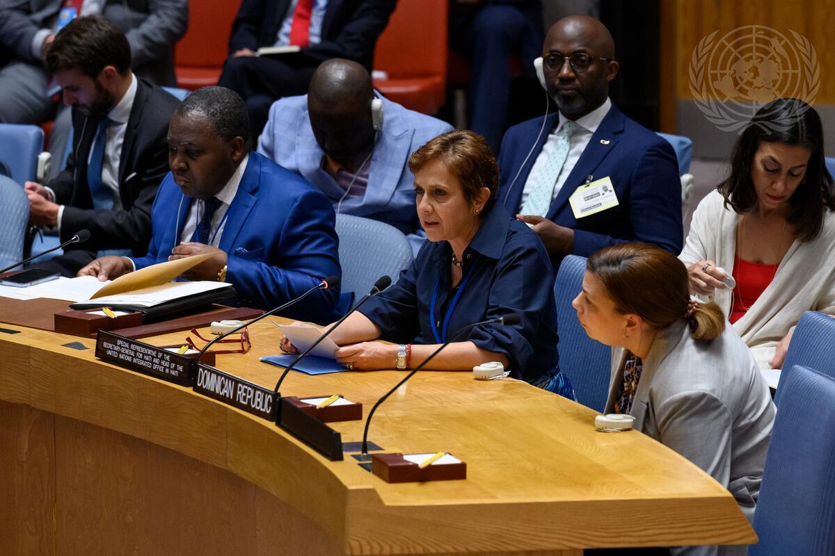 María Isabel Salvador (centre at table), Special Representative of the Secretary-General for Haiti and Head of the United Nations Integrated Office in Haiti, briefs the Security Council meeting on the question concerning Haiti.