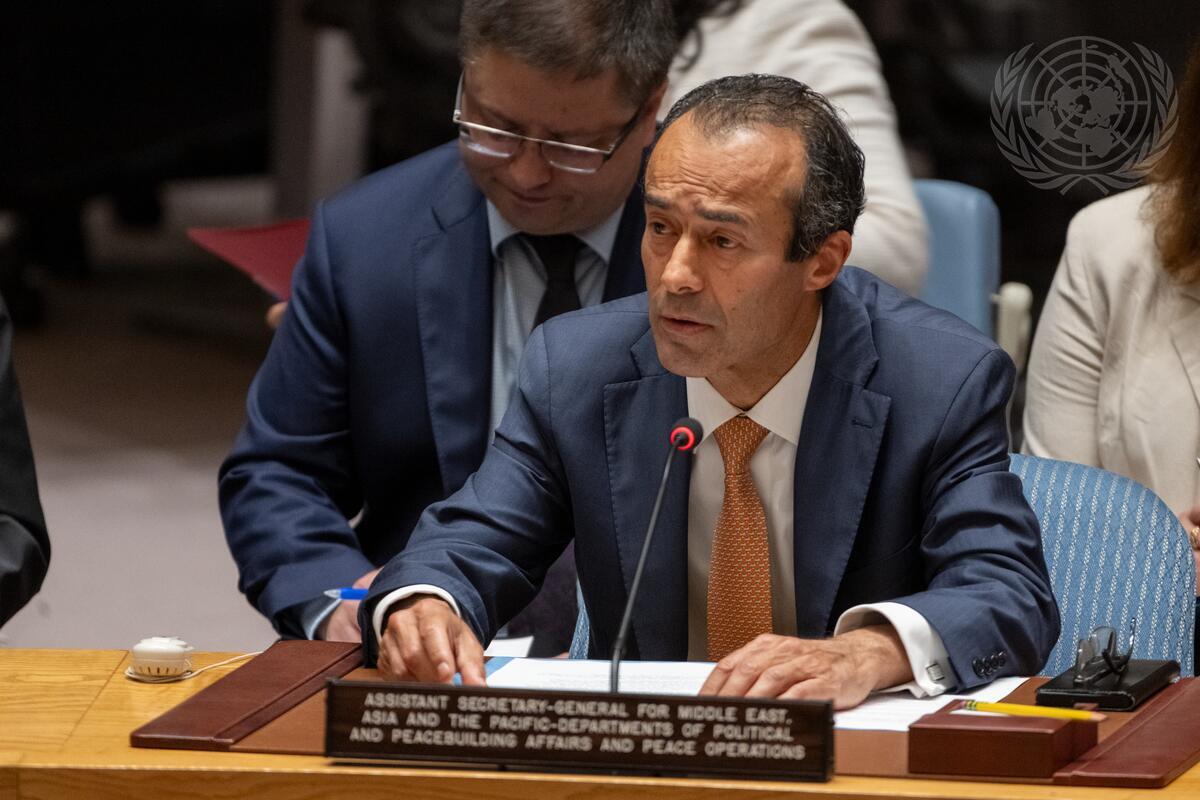 Khaled Khiari, Assistant Secretary-General for Middle East, Asia and the Pacific in the Departments of Political and Peacebuilding Affairs and Peace Operations, briefs the Security Council during the meeting on non-proliferation and the Democratic People's Republic of Korea.