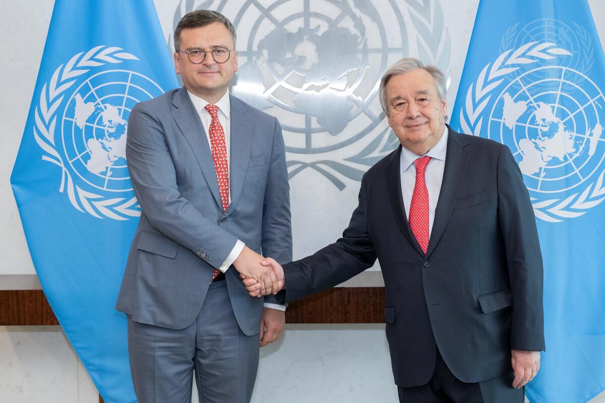 Secretary-General António Guterres (right) meets with Dmytro Kuleba, Minister for Foreign Affairs of Ukraine.