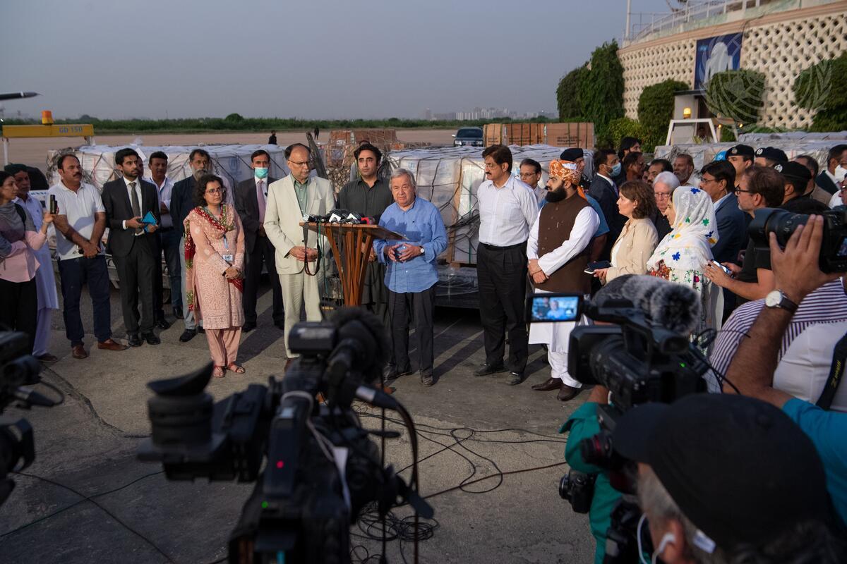 Secretary-General António Guterres (centre), along with Bilawal Bhutto Zardari (centre left), Foreign Minister of Pakistan, briefs the media. The Secretary-General witnessed the impact of the floods in the provinces of Sindh and Balochistan. Over 1,300 lives were lost and tens of millions of people lost their homes, while one-third of the country submerged.