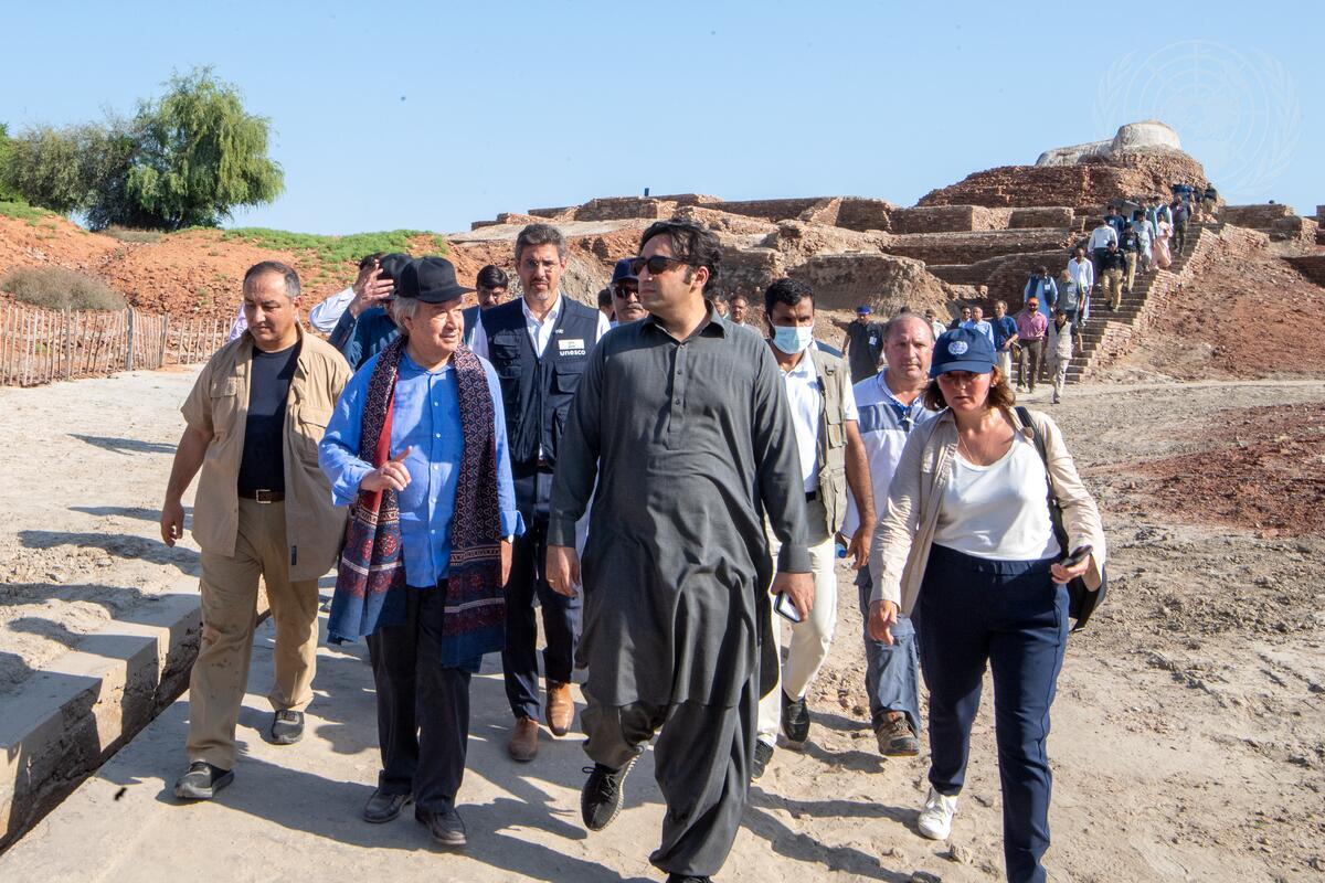 Secretary-General António Guterres (second from left), along with Bilawal Bhutto Zardari (centre), Foreign Minister of Pakistan, witnessed the impact of the floods in the provinces of Sindh and Balochistan. Over 1,300 lives were lost and tens of millions of people lost their homes, while one-third of the country submerged.