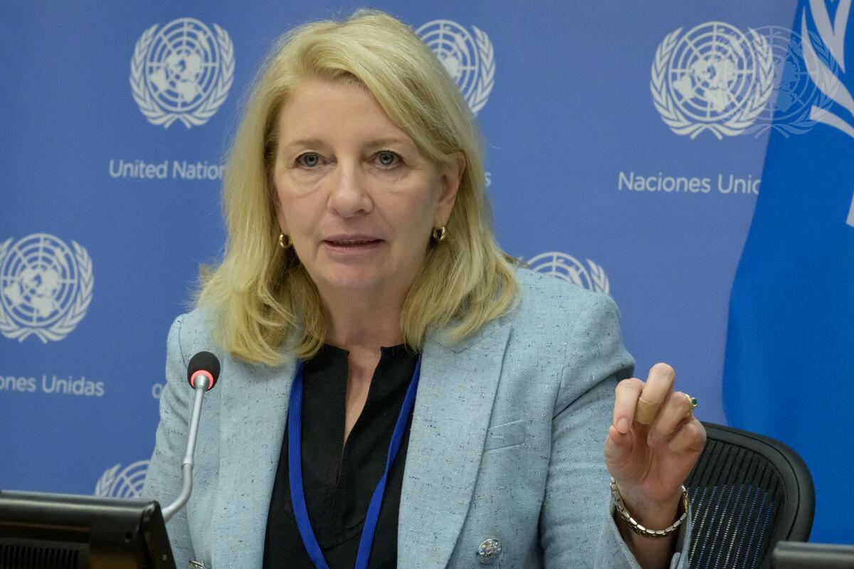 Catherine Russell, Executive Director of UN Children’s Fund (UNICEF), briefs reporters together with Vanessa Nakate (not pictured), climate activist from Uganda and newly appointed UNICEF Global Goodwill Ambassador. Ms. Nakate spoke about her recent trip with UNICEF to the Horn of Africa.