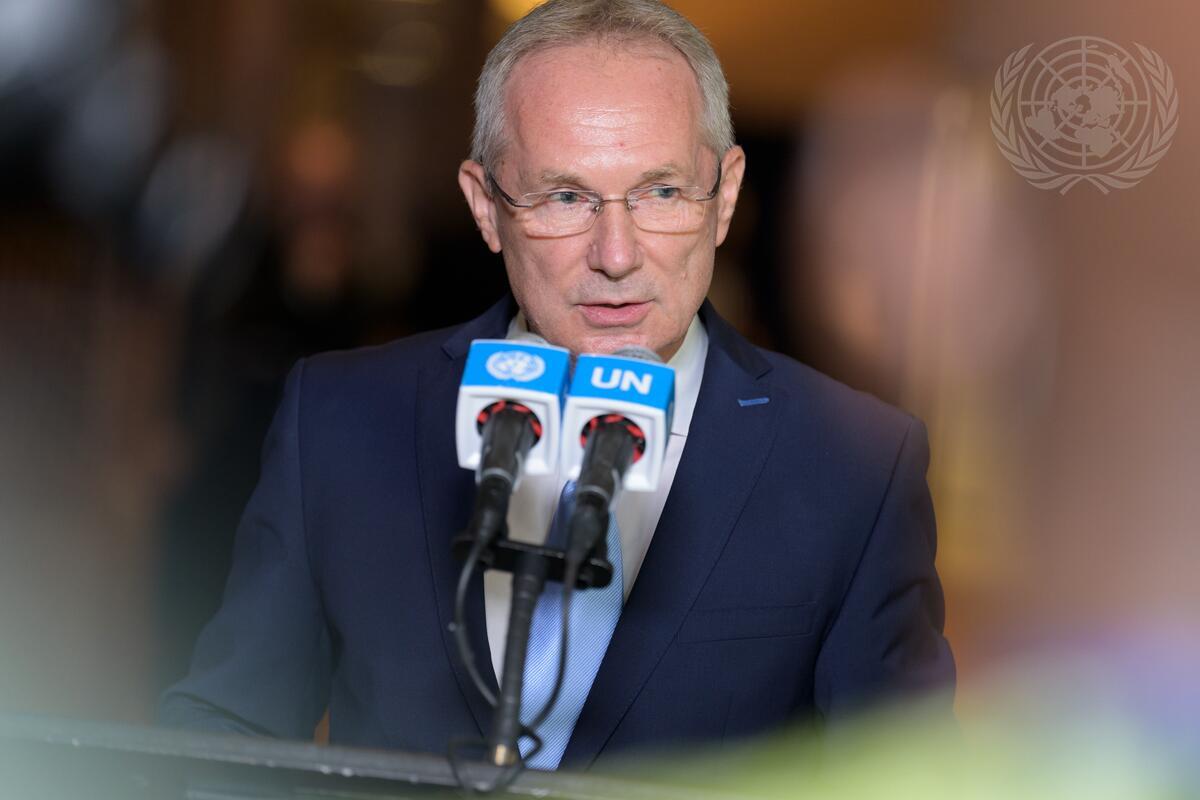 Csaba Kőrösi, President of the seventy-seventh session of the United Nations General Assembly, briefs reporters after the closing meeting of the seventy-sixth session of the General Assembly.