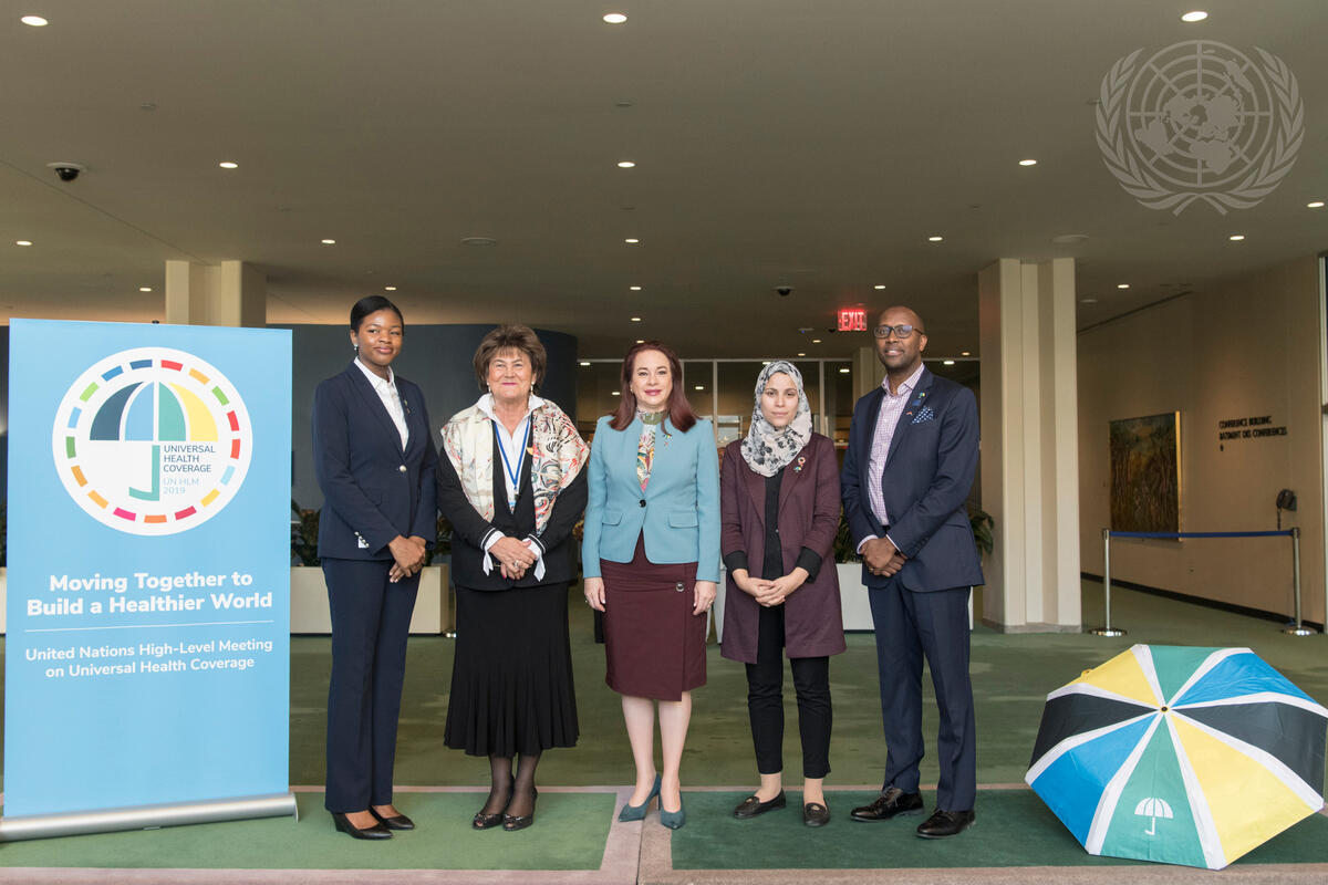 From left to right are: Adaora Okoli, Health for All Story Teller and Ebola Survivor; Zsuzsanna Jakab, Deputy Director-General of the World Health Organization (WHO); Ms. Espinosa Garcés; Alaa Murabit, Medical Doctor and Sustainable Development Goal Global Advocate; and Githinji Gitahi, Co-Chair of the Universal Health Care 2030 (UHC2030).