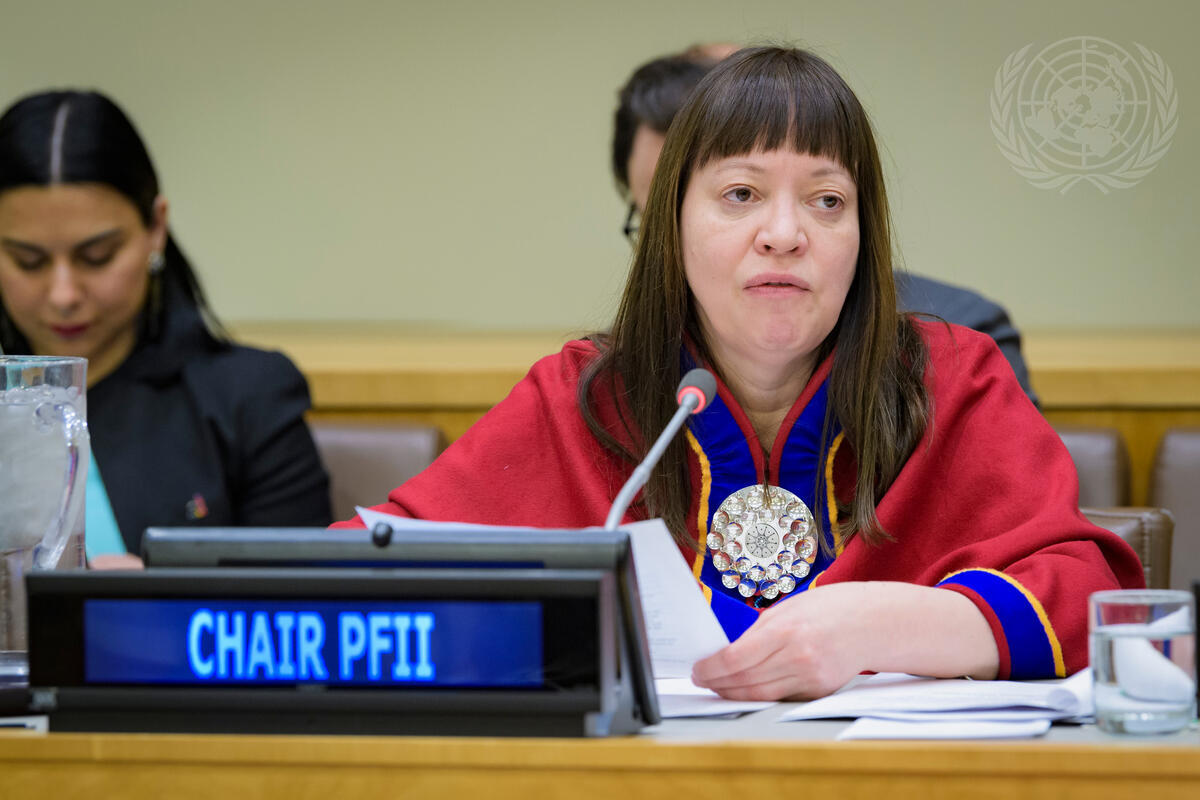 Anne Nuorgam, chair of the eighteenth session of the Permanent Forum on Indigenous Issues, addresses the Informal Interactive Hearing with Indigenous Peoples.