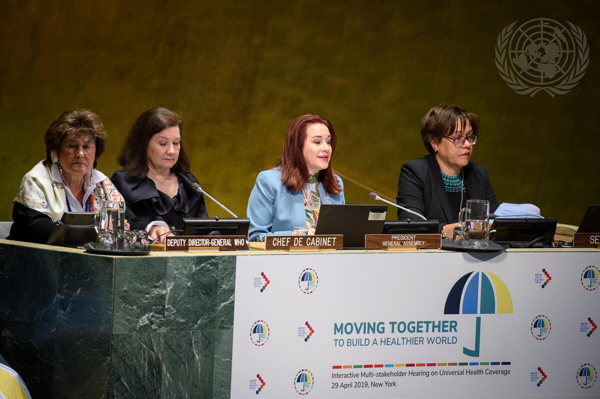María Fernanda Espinosa Garcés (centre right), President of the seventy-third session of the General Assembly, chairs the General Assembly interactive multi-stakeholder hearing on the theme ""Universal health coverage: moving together to build a healthier world"". The meeting is held as part of the preparatory process for the high-level meeting of the General Assembly on Universal Health Coverage.