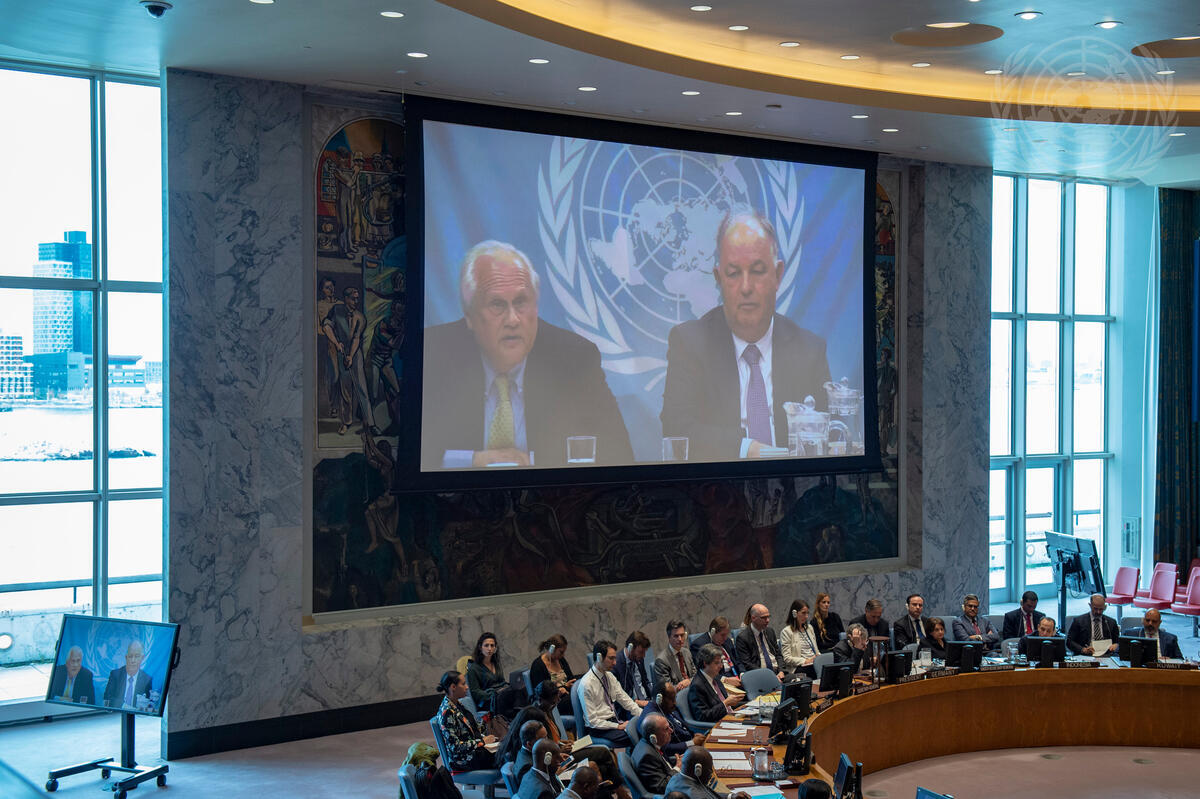Martin Sajdik (on screen left), Special Representative of the OSCE Chairperson-inOffice in Ukraine and in the Trilateral Contact Group, briefs the Security Council meeting on the situation in Ukraine. At right on screen is Ertugrul Apakan, Chief Monitor of the OSCE Special Monitoring Mission to Ukraine.