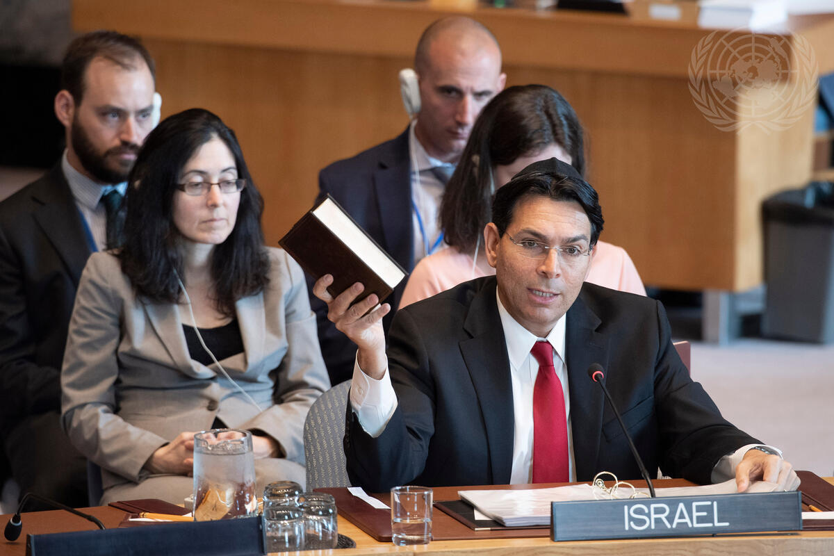 Danny Danon, Permanent Representative of Israel to the United Nations, holds up a bible as he addresses the Security Council on the situation in the Middle East, including the Palestinian question.