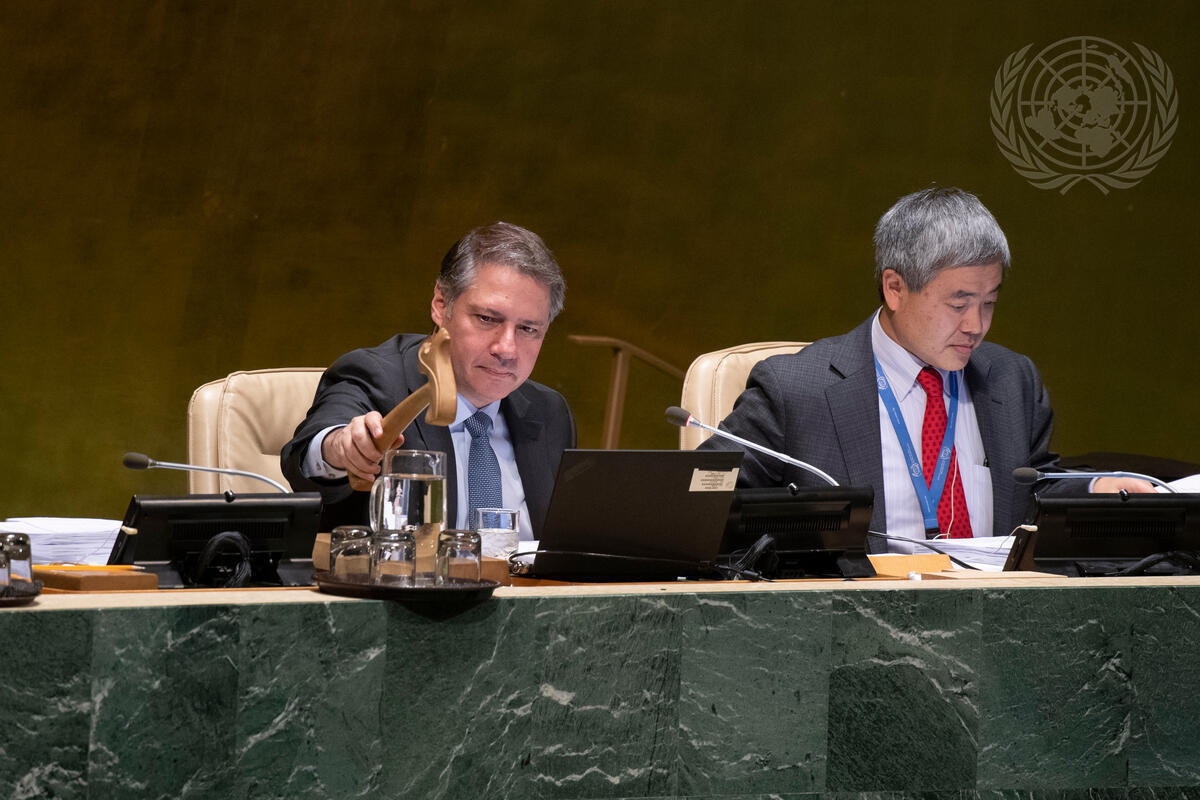 Kornelios Korneliou (left), Permanent Representative of Cyprus to the UN and Vice-President of the seventy-third session of the General Assembly, chairs the General Assembly meeting on the prevention of armed conflict. At right is Kenji Nakano, Chief of the General Assembly Affairs Branch of the Department for General Assembly and Conference Management (DGACM).