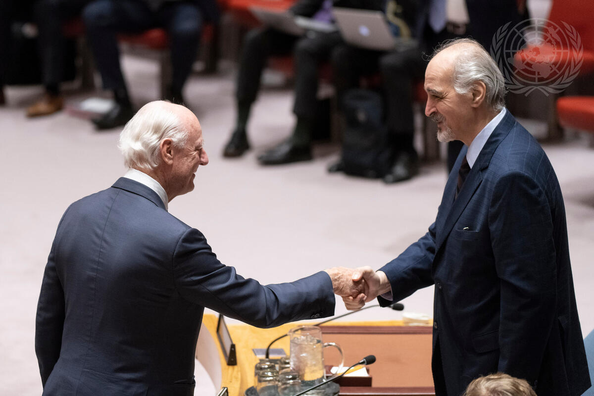 Staffan de Mistura, UN Special Envoy for Syria, greets Bashar Ja’afari, Permanent Representative of the Syrian Arab Republic to the UN, during the Security Council meeting on the situation in the Syria. As it was the last time the Council was officially briefed by Mr. de Mistura in this capacity, he walked around the table to shake hands with everyone who participated in the meeting.