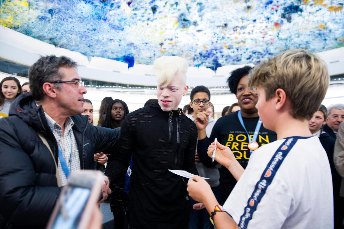 Roben X, rapper and activist, greets participants of an event commemorating Human Rights Day (10 December) in Geneva. This year marked the seventieth anniversary of the Universal Declaration of Human Rights.