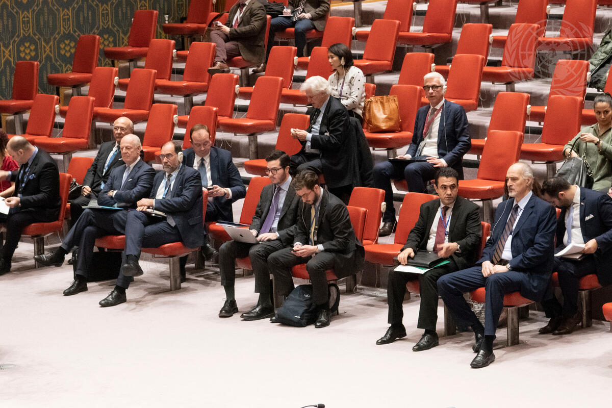 Staffan de Mistura (front row, second from left), UN Special Envoy for Syria, and Bashar Ja’afari (front row, right), Permanent Representative of the Syrian Arab Republic to the UN, await the start of the Security Council meeting on the situation in the Syria.