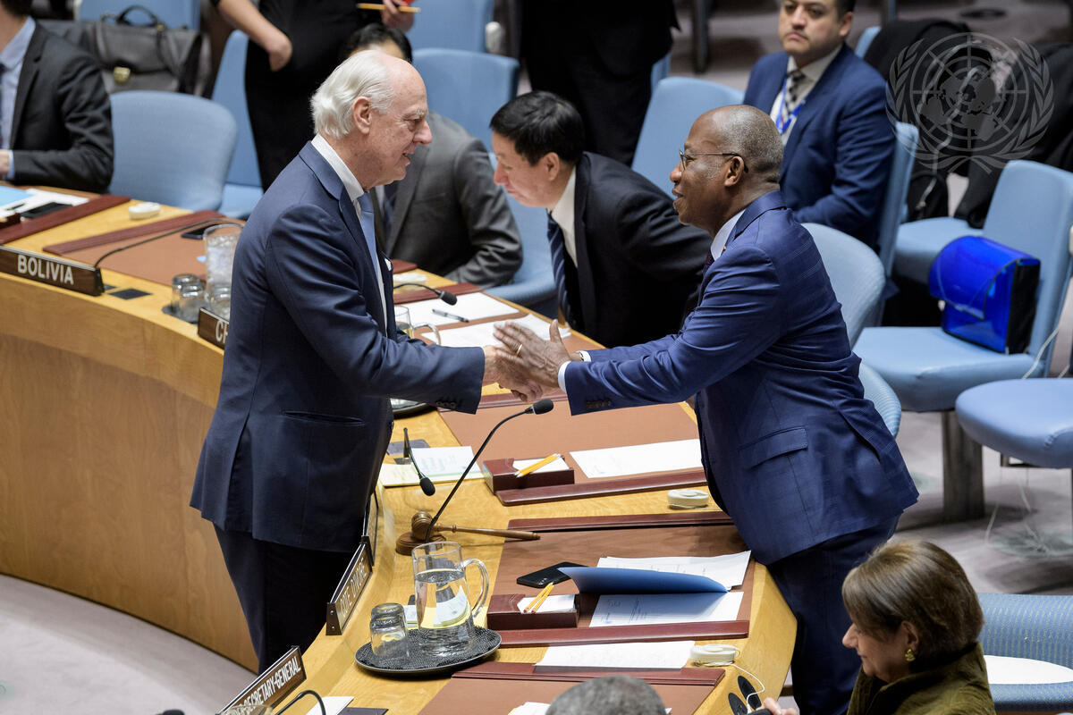 Staffan de Mistura (left), UN Special Envoy for Syria, greets Kacou Houadja Léon Adom, Permanent Representative of Côte d’Ivoire to the United Nations and President of the Security Council for the month of December, before the Security Council meeting on the situation in the Syria. It was the last time the Council was officially briefed by Mr. de Mistura in this capacity.