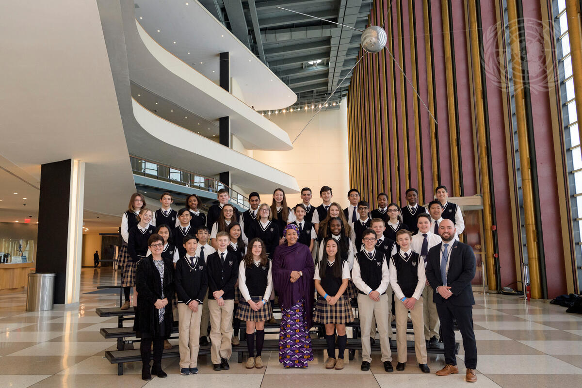 Deputy Secretary-General Amina Mohammed (centre) poses for a group photo with 8th grade students from St. Augustine Roman Catholic School.