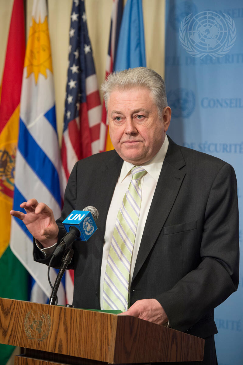 Volodymyr Yelchenko, Permanent Representative of Ukraine to the UN and President of the Security Council for February, speaks to journalists following closed-door Council consultations on the situation in Guinea-Bissau.