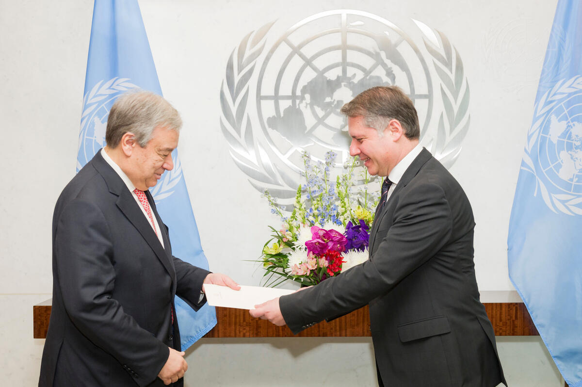 Kornelios Korneliou (right), new Permanent Representative of the Republic of Cyprus to the United Nations, presents his credentials to Secretary-General António Guterres.