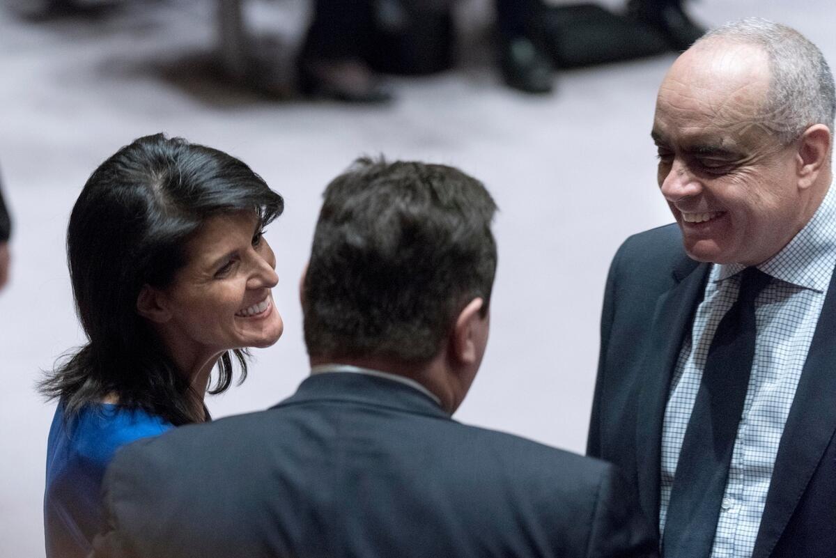 Nikki Haley (left), United States Permanent Representative to the UN, and Amr Abdellatif Aboulatta (right), Permanent Representative of the Arab Republic of Egypt, at the Security Council meeting on the situation in the Middle East, including the Palestinian question.