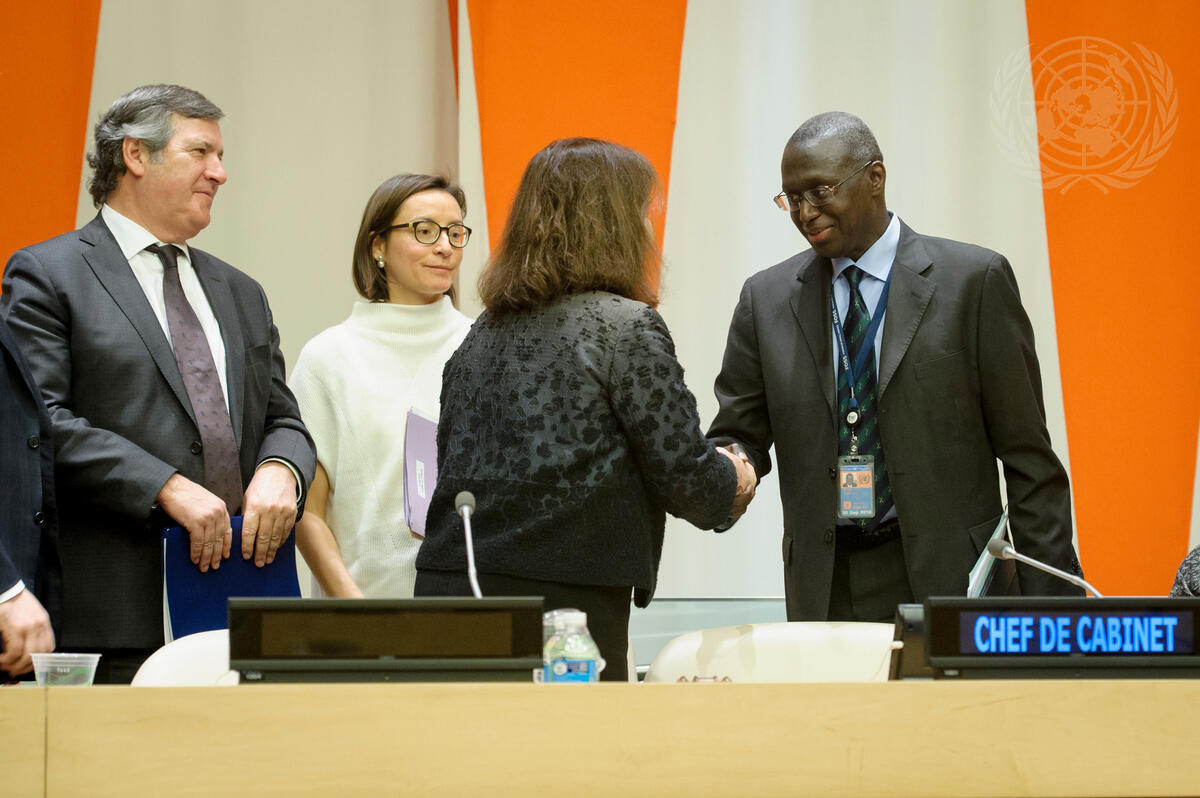Fodé Seck (right), Permanent Representative of the Republic of Senegal to the UN and Chair of the General Assembly's Committee on the Exercise of the Inalienable Rights of the Palestinian People, greets Maria Luiza Ribeiro Viotti, Chef de Cabinet to the Secretary-General, at a meeting of the Committee.