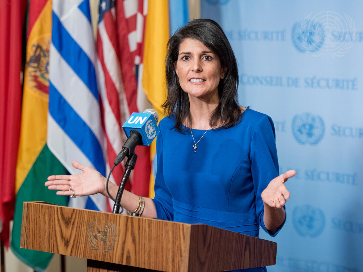 Nikki R. Haley, United States Permanent Representative to the UN, speaks to journalists following a Security Council meeting on the situation in the Middle East, including the Palestinian question.