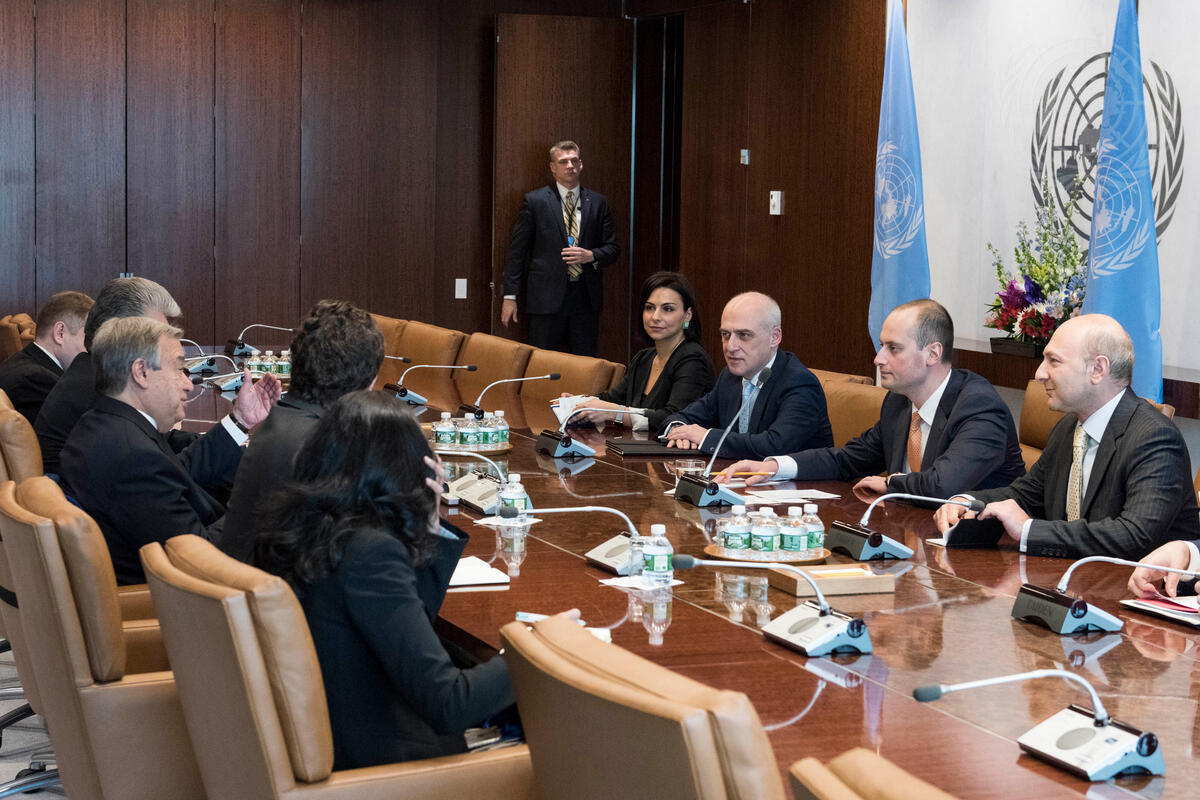 Secretary-General António Guterres (centre left) meets with Mikheil Janelidze (second from right), Minister for Foreign Affairs of Georgia.